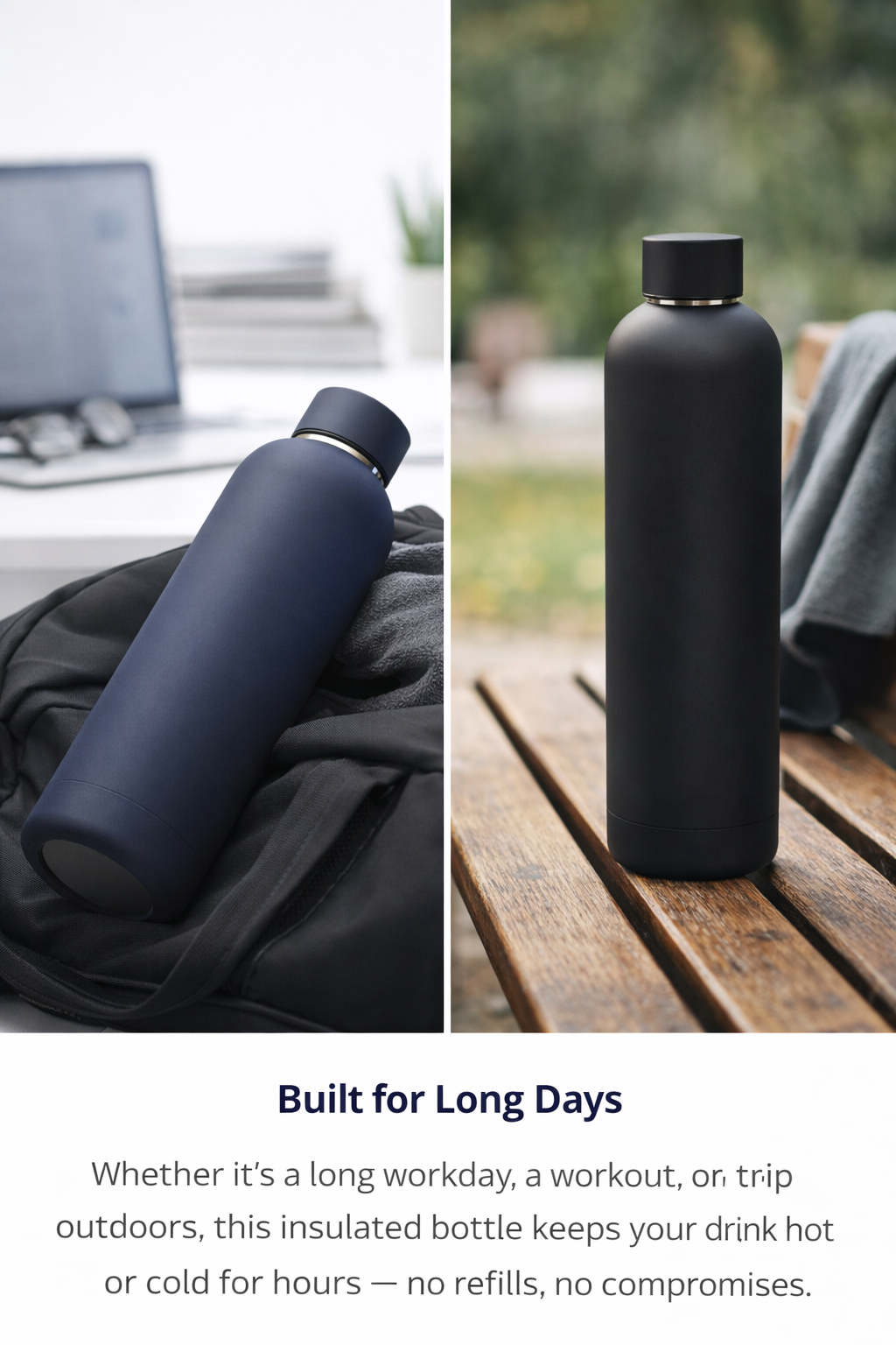Whether it’s a long workday, a workout, or a trip outdoors, this insulated bottle keeps your drink hot or cold for hours — no refills, no compromises.